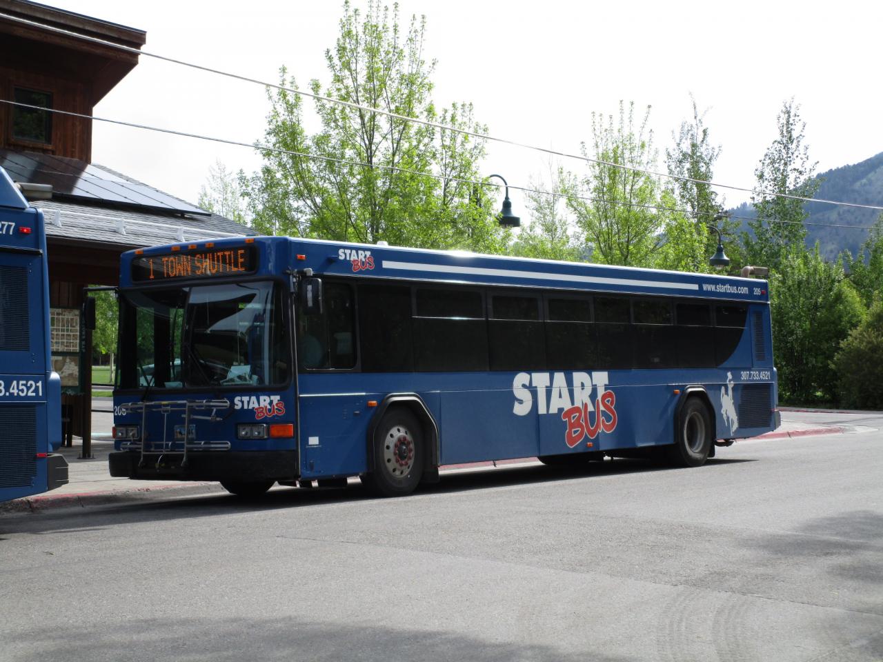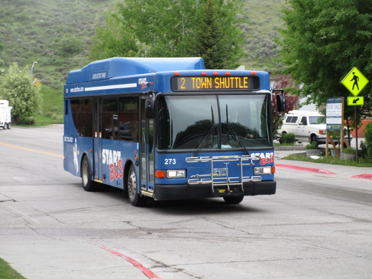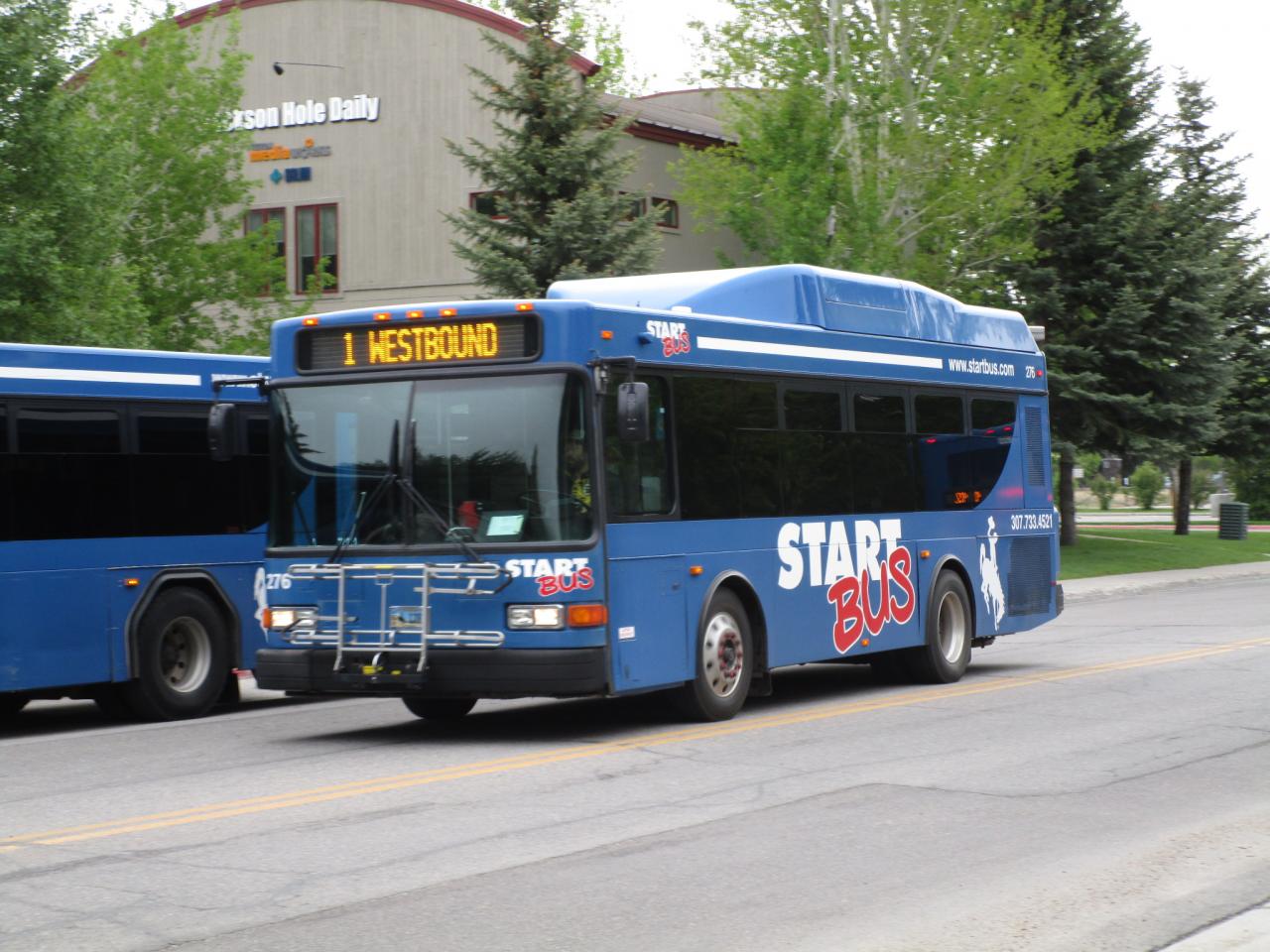 START Bus, the operating name of Southern Teton Area Rapid Transit serving Teton County, Wyoming; is the only other transit agency in Wyoming utilizing heavy-duty buses.  During its non-Winter schedules of operations, its services are mostly run with Gillig Low Floor's bought new (except 2 MCI commuter coaches on routes 30 and 40, which I did not spot due to reduced commuter services on Memorial Day).  It has 4 Gillig Low Floor 29ft. Hybrid buses numbered 272-273 (EPA-2007 buses new in 2009) and 276-277 (EPA-2010 buses new in 2011), and they are only used on routes 1 and 2 (Jackson Town Shuttle's).  2009 bus 273 and 2011 bus 276 are pictured near the Kmart in Jackson.