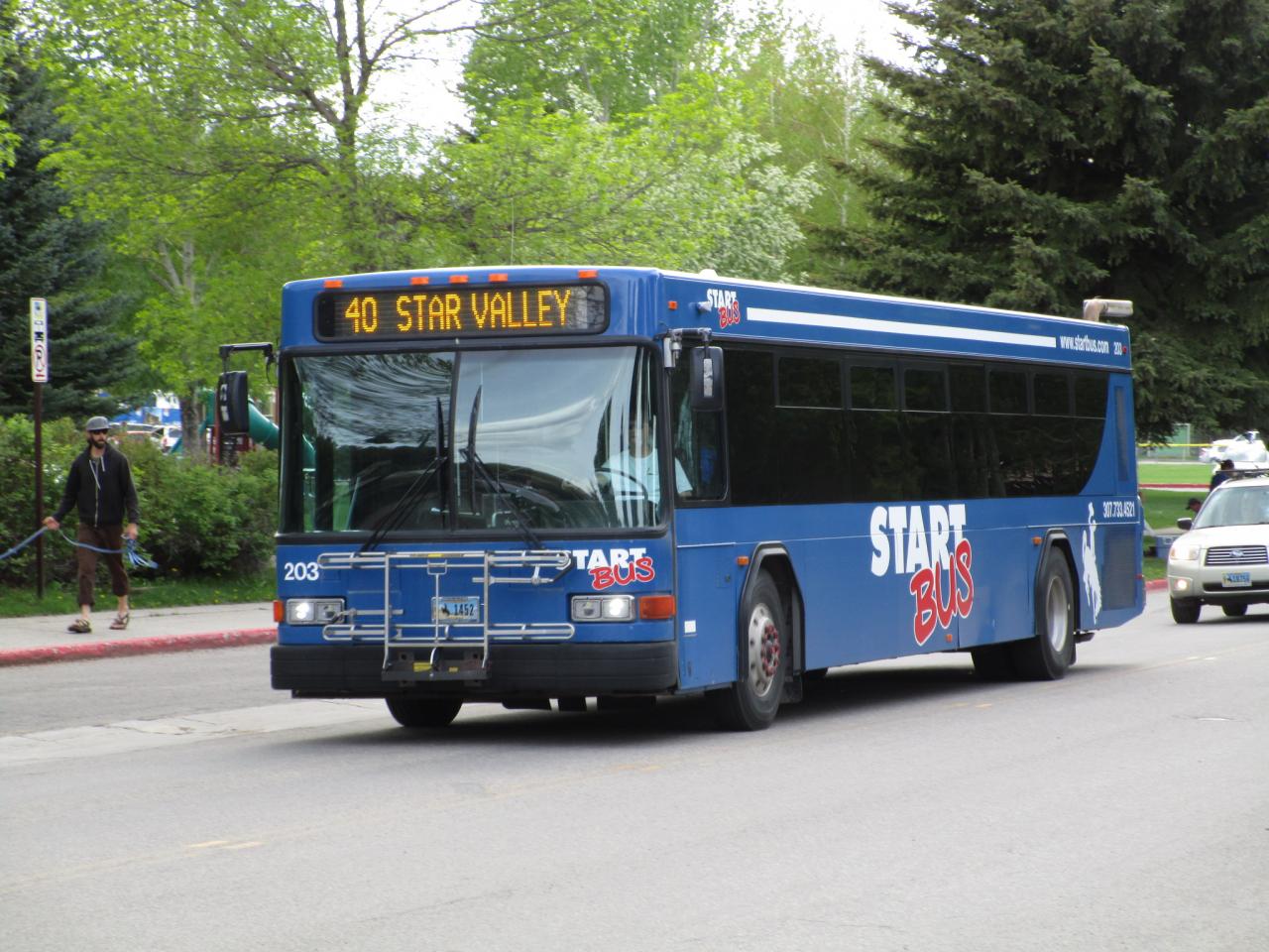 The agency has 10 Gillig Low Floor 40ft. diesel buses bought new (Five 2009 buses 201-205, one 2012 bus 206, one 2014 bus 207 and three 2015 buses 208-210).  They are chiefly used on the Teton Village to Jackson family of color-coded routes in the 20-series, of which route 20 (Green Line) is the only variant operating outside winter.  They also operate two trips each on the commuter routes 30 and 40 (with the remainder run by a MCI coach each).  However, they can also occasionally show up on the Town Shuttle's, as depicted by 2009 bus 205 pictured at the Deloney Parking Lot in Jackson.  2015 buses 208 and 210 are pictured at the Teton Village bus terminal and Snow King Center in Jackson on routes 20 and 30 respectively.  Finally, 2009 bus 203 are pictured at the same spot as bus 210 on route 40 duty.  The commuter runs I've spotted were the only afternoon runs for Memorial Day.
