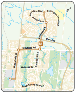 Route 81 is a route starting at Sandalwood Loop and ending at Kennedy Road and Dougall Avenue. The route primarily serves Caledon, linking the community to northern Brampton.